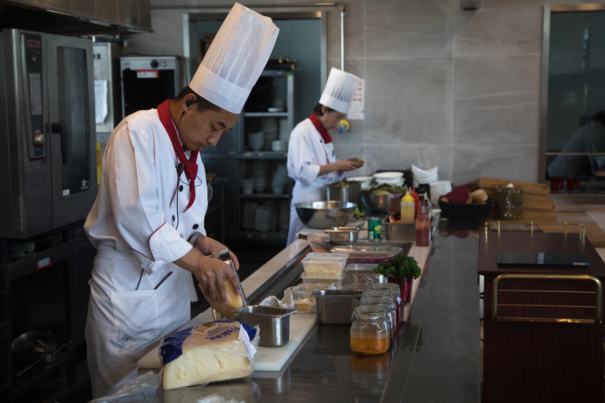 On s’engouffre dans les œufs couleur tomate qui mènent au sommet de la montagne. La station intermédiaire, à 2003 mètres, abrite L’Alpine Lodge, qui ne sert que des plats autrichiens. «Les Chinois sont particulièrement friands de mes spätzlis, de mes schnitzels et de mes jarrets de porc rôtis», s’enthousiasme Andreas Sams, le chef de 27 ans originaire de la région de Salzbourg.