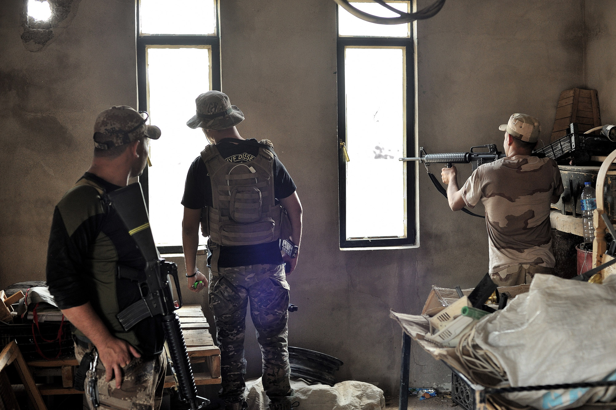Dans les étages supérieurs de l’immeuble, les hommes de Mohammed ont ménagé une position d’observation et de tir. Deux ouvertures verticales plongent sur les positions ennemies. En face, à deux cents mètres, trois drapeaux de l’EI surmontent une petite butte de terre. «Ils ne peuvent plus attaquer, que résister», commente Kassem Rahim, le sergent-chef de l’unité, qui doute cependant que la promesse faite par l’état-major de reprendre totalement la ville avant le ramadan se réalise: «C’est une question de semaines plutôt, mais les djihadistes se battront farouchement dans chaque maison et utiliseront les civils comme boucliers humains.» Avez-vous fait des prisonniers? Kassem Rahim sourit: «C’est une guerre particulière, sans prisonniers. Les djihadistes préfèrent mourir plutôt que d’être capturés.»