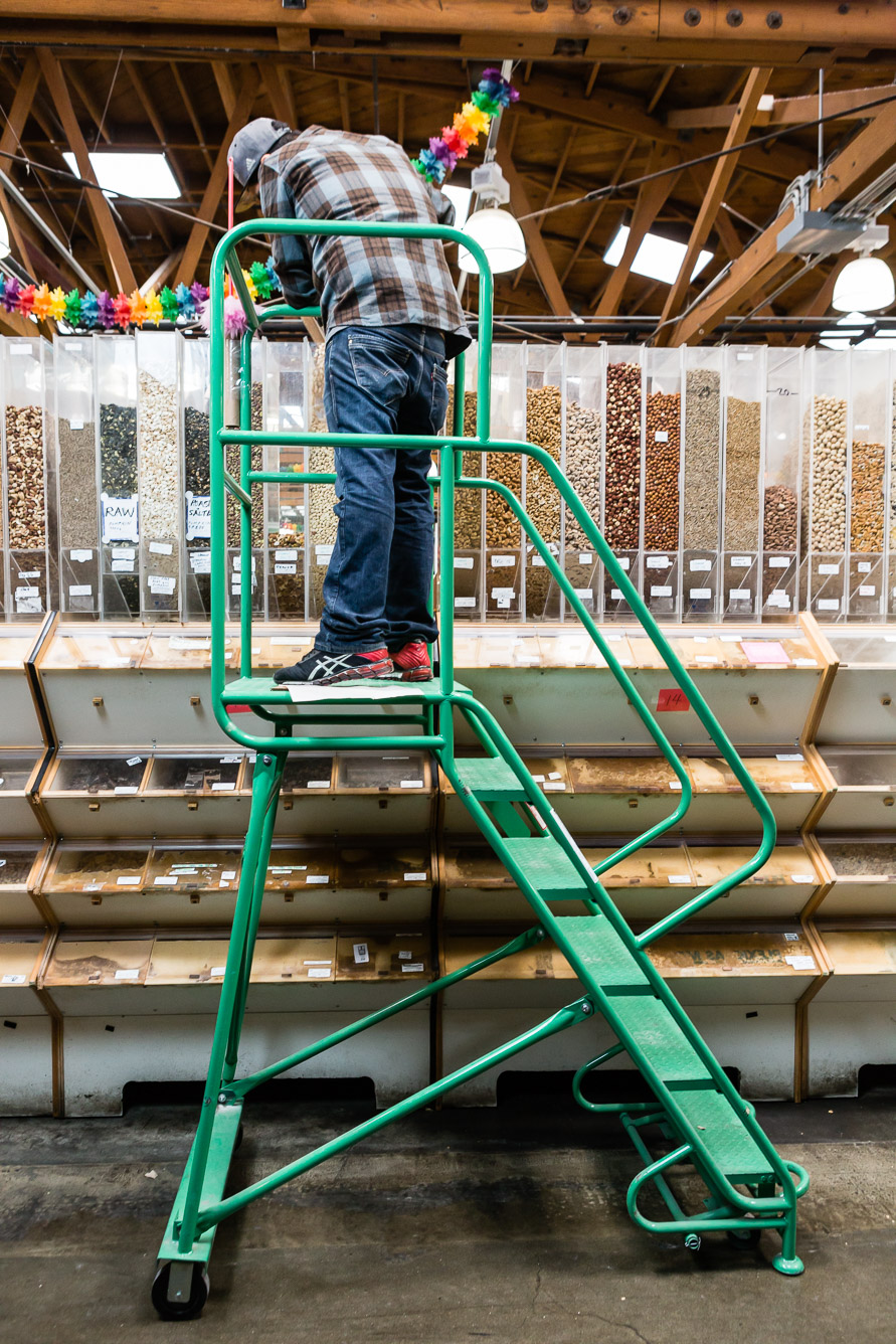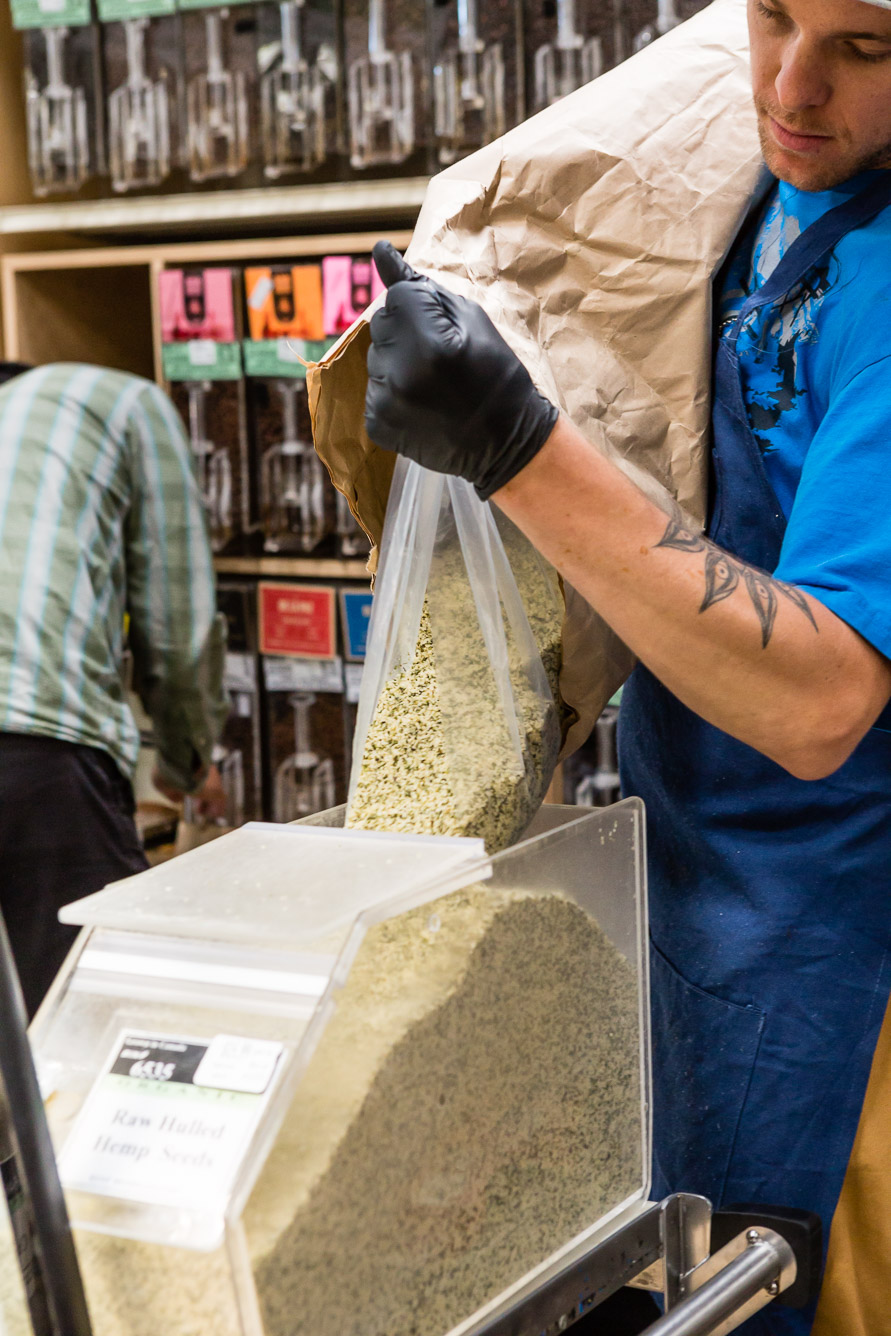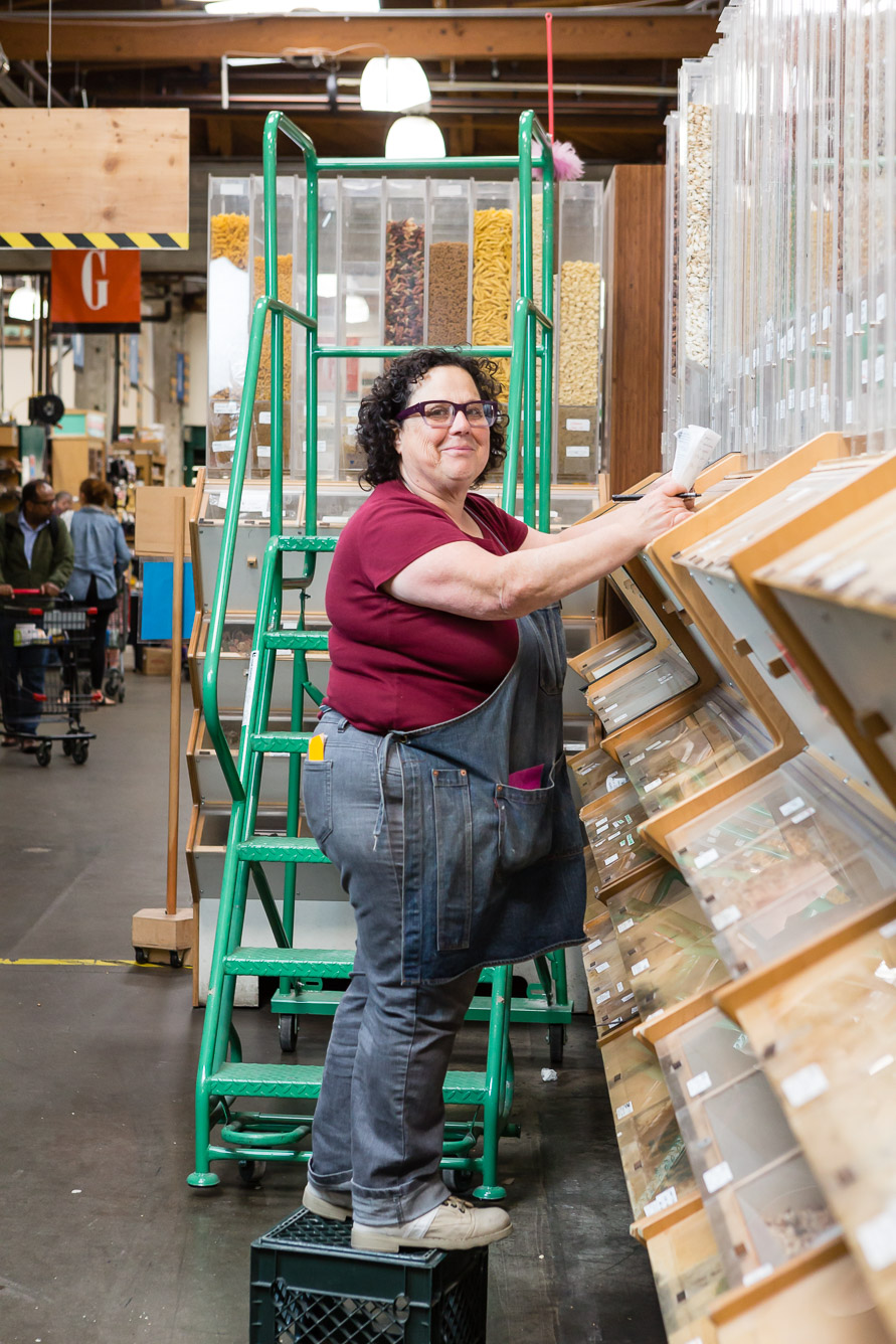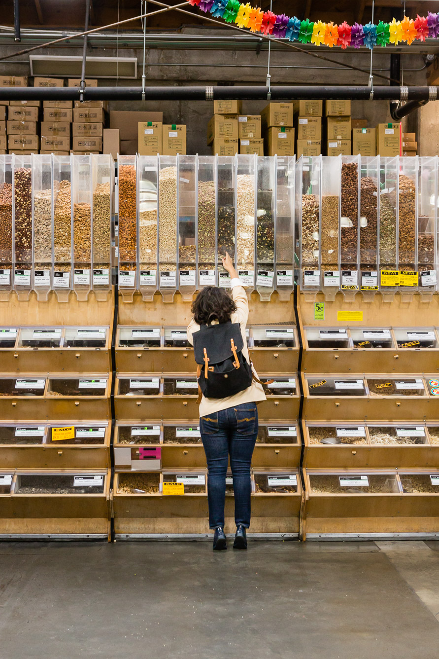 Les rangées de bocaux s’alignent en une suite infinie de thés et d’épices tandis que des centaines de contenants en plexiglas présentent graines, fruits secs, pâtes, riz et farines biologiques dans un joyeux dégradé. Au centre du rayon en vrac, des cuves en métal proposent un grand choix de vinaigres et d’huiles. Plus loin, un évier est calé entre les étagères pour faciliter la recharge de shampoings, savons liquides et autres produits ménagers depuis des réservoirs à pompe. Au plafond, des guirlandes mexicaines accompagnent une fière bannière qui célèbre les 40 ans du magasin, 1975-2015. Bienvenue chez Rainbow Grocery, la coopérative hippie de San Francisco, véritable arc-en-ciel de couleurs, du bio et du vrac au cœur du Mission District.