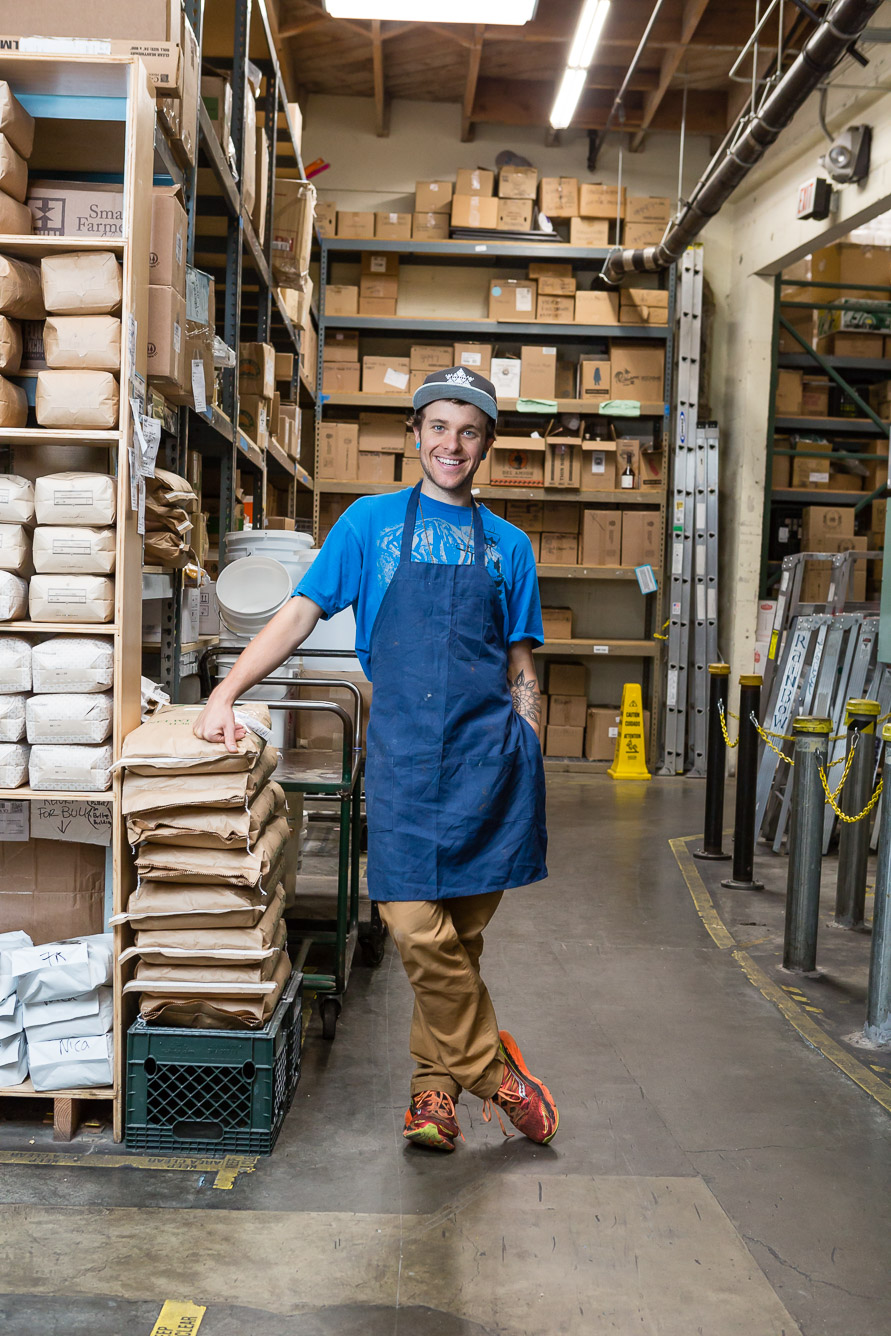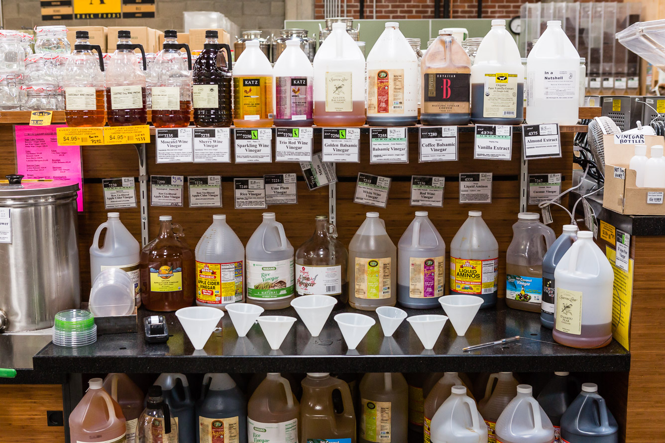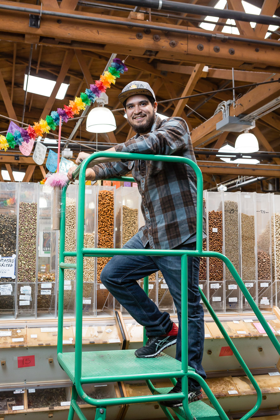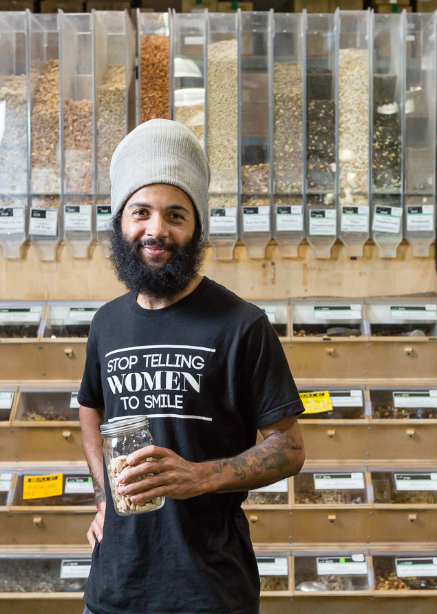 Les rangées de bocaux s’alignent en une suite infinie de thés et d’épices tandis que des centaines de contenants en plexiglas présentent graines, fruits secs, pâtes, riz et farines biologiques dans un joyeux dégradé. Au centre du rayon en vrac, des cuves en métal proposent un grand choix de vinaigres et d’huiles. Plus loin, un évier est calé entre les étagères pour faciliter la recharge de shampoings, savons liquides et autres produits ménagers depuis des réservoirs à pompe. Au plafond, des guirlandes mexicaines accompagnent une fière bannière qui célèbre les 40 ans du magasin, 1975-2015. Bienvenue chez Rainbow Grocery, la coopérative hippie de San Francisco, véritable arc-en-ciel de couleurs, du bio et du vrac au cœur du Mission District.